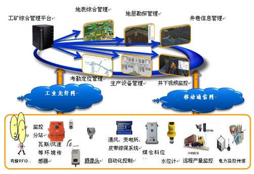 运用物联网技术设备,在煤矿地下巷道中各监测点位上布置各类探测传感装置,通过近距离无线通信模块组成监测网络,解决井下几百里没有通信信号的问题;远程则通过移动通信的GPRS或CDMA网络,实现基于TCP/IP协议的监测数据的远程无线传输,直接与手机、计算机系统等相连,形成泛在计算计算网络,覆盖井下各点。当监控装置监测到瓦斯浓度、风速超过限定值或主风扇开、停或运行负荷变大时,GPRS数据通信模块将信息传递到监控站,同时通过短信(SMS)方式将报警信息发送到相关人员的手机上,各级领导就能及时掌握瓦斯超限情况,及时指挥协调安全生产工作。