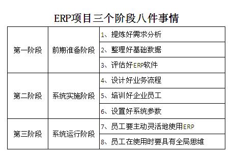 吴学强:ERP项目主动实施三个阶段八件事情任何企业要想把ERP项目做好,就一定要采取主动实施的方式,而要想做到主动实施,首先企业员工要积极的参与ERP项目,然后要控制好项目的进度,并且掌握好ERP实施的主动权。在此基础上,需要做好下面的一些事情,我们总结为ERP项目三个阶段八件事情。 第一阶段、前期准备阶段这一阶段要做好三件事情,即要提炼好需求分析、整理好基础数据以及评估好ERP软件。 第二阶段、系统实施阶段这一阶段,我们同样要做好三件事情,也就是设计好业务流程、培训好企业员工、设置好ERP系统参数。在这个阶段,需求分析和数据整理工作是承接第一阶段要继续做好的工作,所以这一阶段也可以认为要做好五件事情。 第三阶段、系统运行阶段这一阶段要重点做到两点,就是员工要主动灵活地使用ERP,并且在使用时要具有全局思维。 只有做好了这三个阶段的八件事情,我们才能真正的把ERP实施好用好。